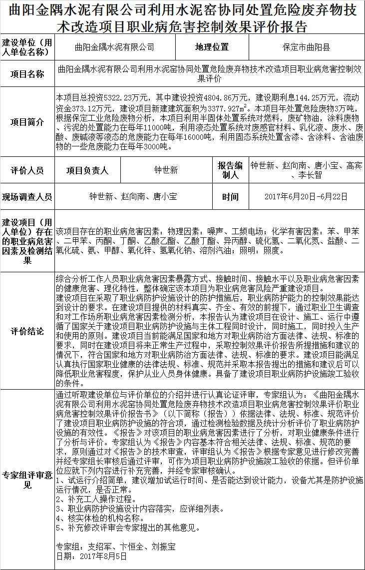 曲阳金隅水泥有限公司利用水泥窑协同处置危险废弃物技术改造项目职业病危害控制效果评价